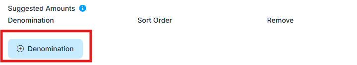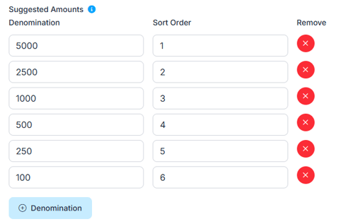 - Click the button for Denomination to add the amounts and what sort order they are to be displayed on the donation page.